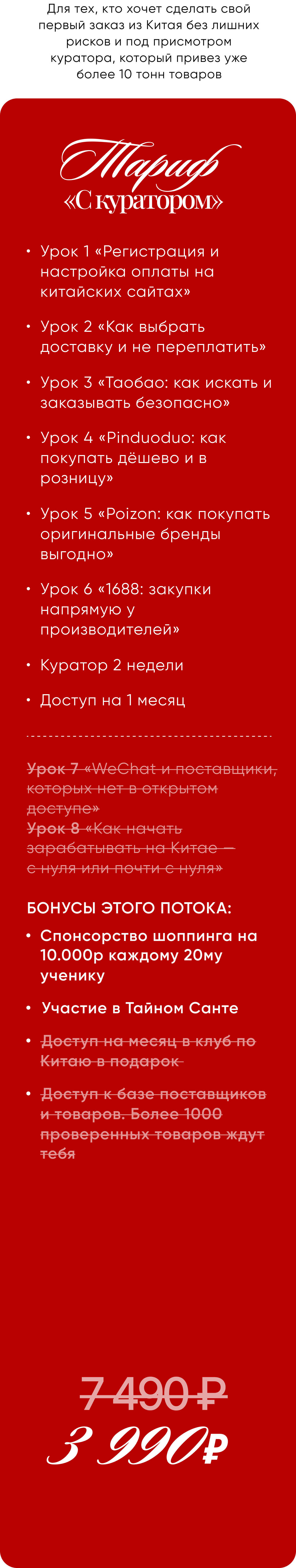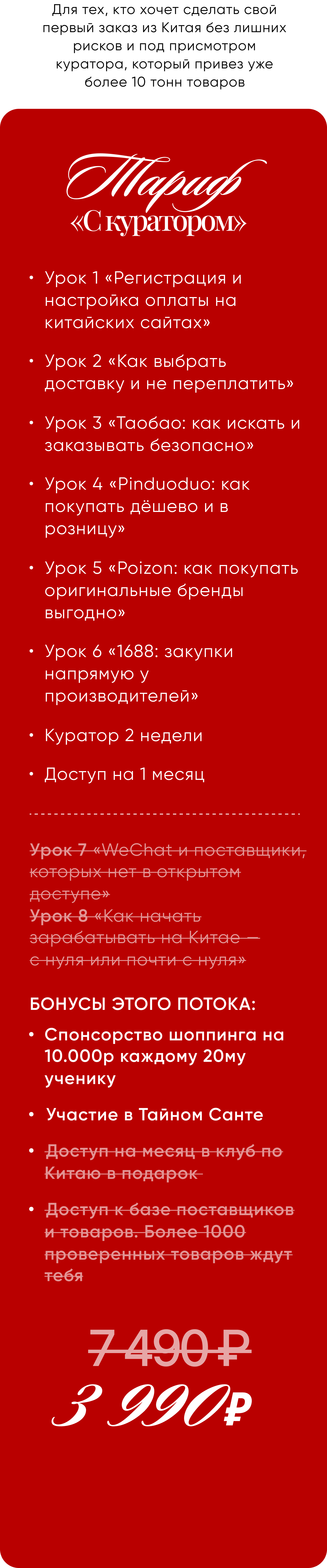 Рассрочки нет — курс и так стоит как пара заказов с китайских сайтов. Мы специально сделали цену доступной, чтобы вы могли стартовать сразу, без лишних обязательств и кредитов. И начать экономить или зарабатывать — уже на следующей неделе.